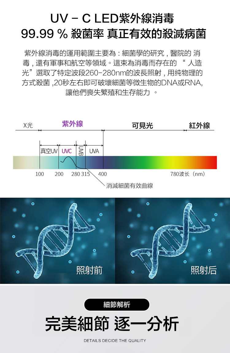 這束為消毒而存在的 “ 人造光”選取了特定波段260-280nm的波長照射 , 用纯物理的方式殺菌 ,20秒左右即可破壞細菌等微生物的DNA或RNA,讓他們喪失繁殖和生存能力 。