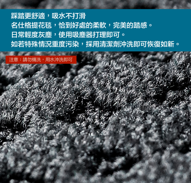 上層提花毯,耐髒污更耐磨,吸水不打滑,腳踩更有厚實感