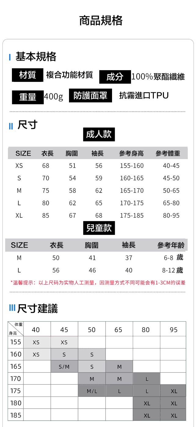 成人:XS . S . M . L . XL